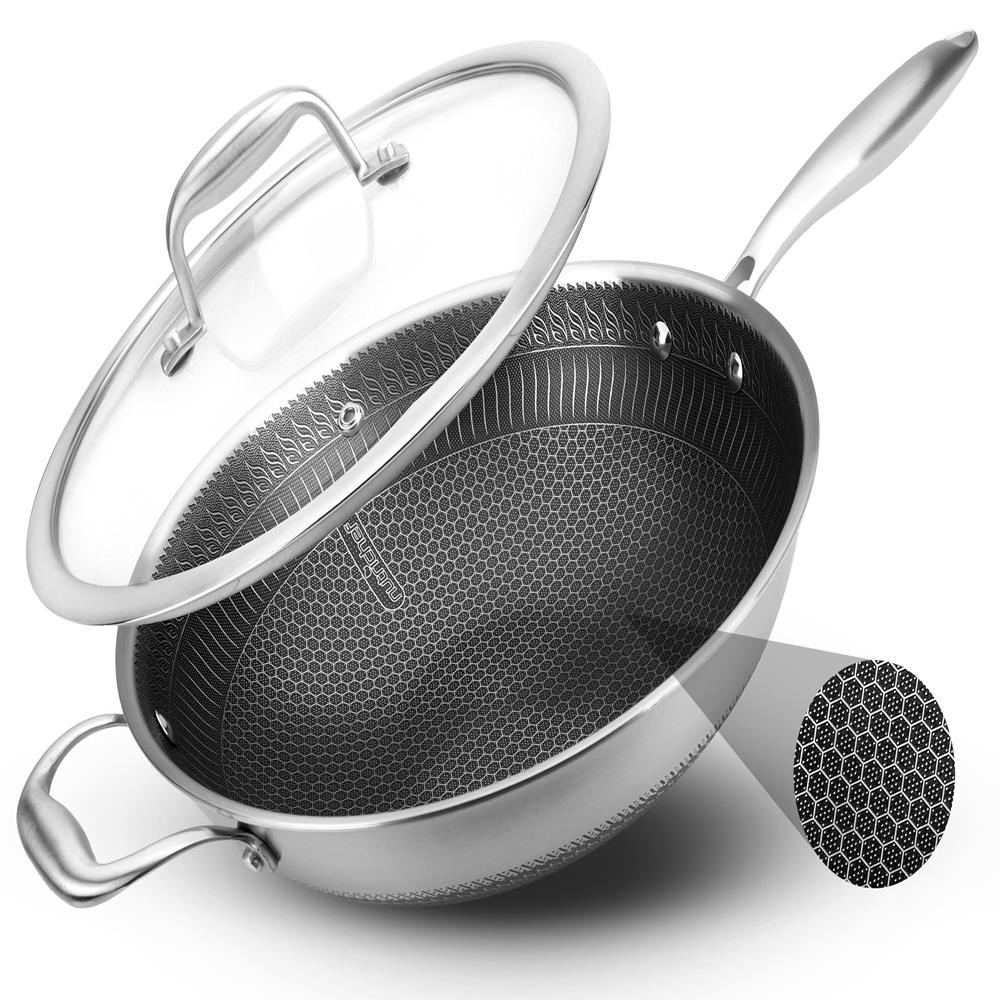 12'' Durable Wok with Side Handle - Triply Stainless Steel Cookware, DAKIN Etching Non-Stick Coating Inside and Outside