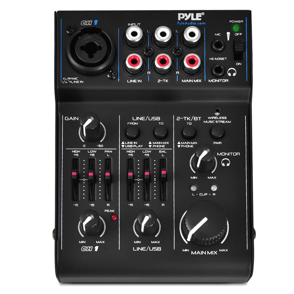 The Pyle PAD30MXUBT 3-Channel Bluetooth Audio Interface DJ Mixer is like a portable recording studio. It's perfect for computer-based audio editing, while adding fine-tune adjustments to your sound. Connect to your computer via the USB port and this audio interface mixer has the ability to function as the sound card. System features include Bluetooth wireless audio connectivity, +18V phantom power supply, XLR microphone input, 3.5mm (1/8'') microphone input, 3.5mm (1/8'') headphone jack, RCA (L/R) stereo input & output connectors, 2-TK RCA (L/R) Input Connectors, audio signal clip LED indicator lights, input selection control buttons. Adjust each input's gain, master gain and monitor levels using the rotary faders. System includes USB wall adapter power supply & connection cable.