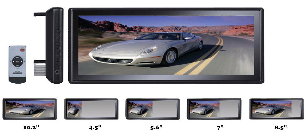The PLM102 rear camera mirror system is practically magic. Clip it on to your existing mirror and watch the magic happen. While off, this unit functions as a beautiful wide-angle 11' x 4' rear view mirror - but it turn it on and you can display video! You can adjust the video so that it doesn't take up the whole mirror: choose from 10.2', 8.5', 7', 5.6', and 4.5'. The dual video inputs let you hook up multiple devices, such as DVD players and iPods. An anti-glare coating increases visibility and keeps you safe. Comes with a wireless remote control with on-screen menu so you can adjust the picture to your liking. Includes universal clip on latch for all existing mirrors.