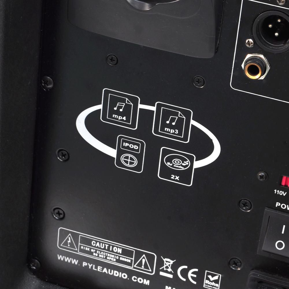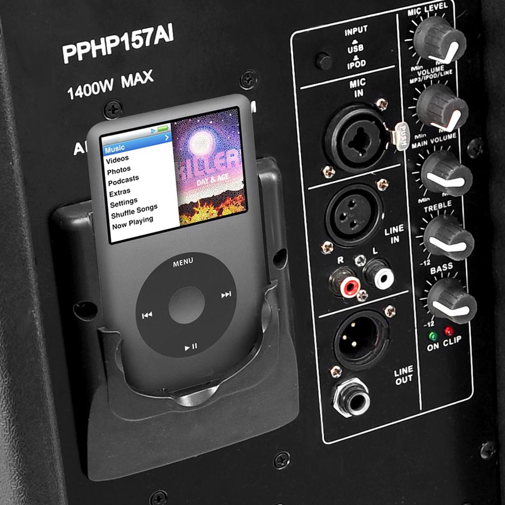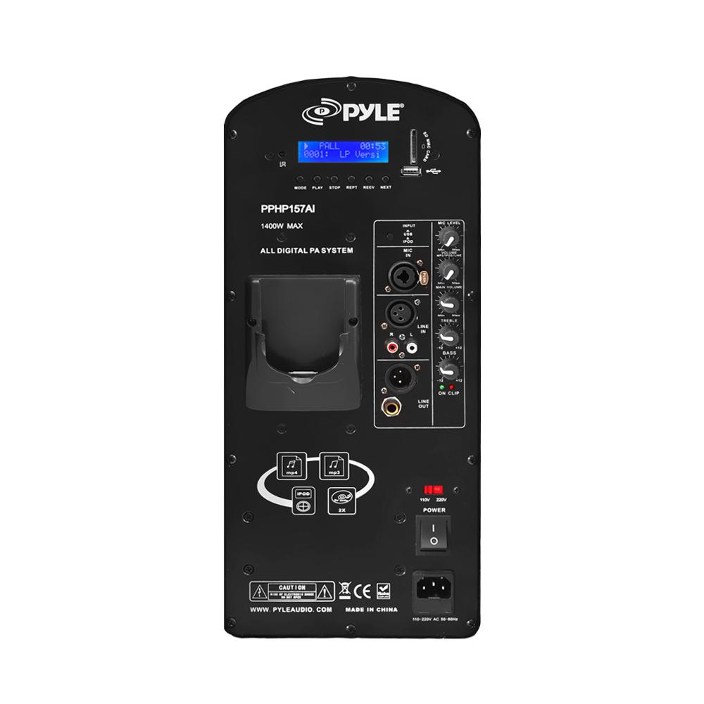 The Pyle PPHP157AI PA Loudspeaker is the ultimate high-powered cabinet system. It comes loaded with features including an impressive 1400 watt power output, 15'' subwoofer, 30-pin iPod dock, USB flash drive reader, SD memory card reader and plenty more to add full-ranged, distortion-free sound where you need it! Just plug it in and you're ready play your favorite MP3 digital audio files. Connect your iPod into the built-in 30 pin dock -- or insert a USB flash drive or SD memory card loaded with music from your computer's media library. It pushes everything from pounding bass to a chirpy high-end, that creates wide-coverage two-way sound from this versatile, all-in-one amplified cabinet. Connect a microphone, instrument, amplifier, computer, MP3 player, additional speaker and more. This PA speaker comes equipped with XLR combo (microphone) input, XLR 3-pin input, RCA line input, XLR line output and 1/4'' line outputs. You will be able to accommodate multiple microphones and any electronic instrument simultaneously. Then, control it all with independent rotary controls from the speaker's control center located on the back of the unit. Customize your audio and make it sound just the way you want with bass and treble controls, and use the 3-channel mixer to perfect the balance between your iPod, mic, and audio input. Located on the bottom of the housing is a 35mm pole mount socket and tightening tension knob for securing the system in a multitude of applications. It's Ideal for bands and DJs serving as the main audio amplification system, so you can rock the audiences indoors or out. Whether you are at home, in the yard, on the stage or at the club, the Pyle PPHP157AI PA Speaker System will make it loud for the crowd!