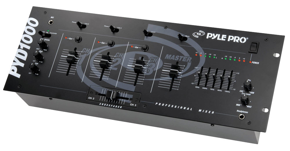 This 4U rack-mountable 3-channel mixer from Pyle Pro is a small wonder and a great addition to any DJ setup. It's got 3 sets of two inputs, two of which can take a phono or line signal - you choose which input you want on each channel. This mixer has ¼' jack input for a mic with talkover switch, so it's great for a DJ setup with two turntables and a microphone. The 5 band master EQ gives you total control over the shape of your sound. LEDs above the volume show you the levels on each of the 2 RCA output channels (left and right). It's equipped with a crossfader, with discrete volume controls and cue buttons for each channel. The ¼' jack headphone jack on the front lets you test your mix before unleashing it unto the world. This unit is robustly constructed and takes both 110 and 220 V AC input.