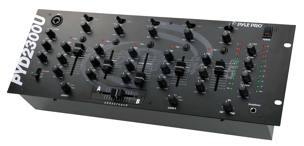 The PYD2300U is a powerful, 5-channel rack mountable mixer that's a welcome addition to any large DJ setup - and now you can connect to your laptop or desktop via USB for digital, distortion-free input and output. This mixer is equipped 8 RCA line inputs - 5 stereo inputs, 2 of which can be used for phono inputs, and 2 mic inputs (one balanced XLR/1/4' combo with high and low rotary EQ, one ¼' jack). The USB jack allows you to connect to your PC or Mac, so you can use computer DJ software to play back or record your mix. A talkover switch easily allows you to play music and hear the MC's voice at the same time. Each channel has a 3 band rotary EQ, rotary gain, volume slider, and LED level readout, including the master output channel. Cue buttons above each channel allow you to preview parts of your mix through headphones or the booth output before you play it for the audience. Outputs include a ¼' headphone jack, an RCA booth output so you can hear your mix in while DJing, and the 2 master outputs: one pair of stereo RCA jacks, one pair of XLR jacks for balanced output to an amplifier or receiver. The assignable crossfader lets you move smoothly between any 2 input channels of your choice. Dual VU meter indicates the levels of the left and right master channels, so you'll know if your mix is too loud, too quiet, or just right. The PYD2300U runs on both 110 and 220 V.